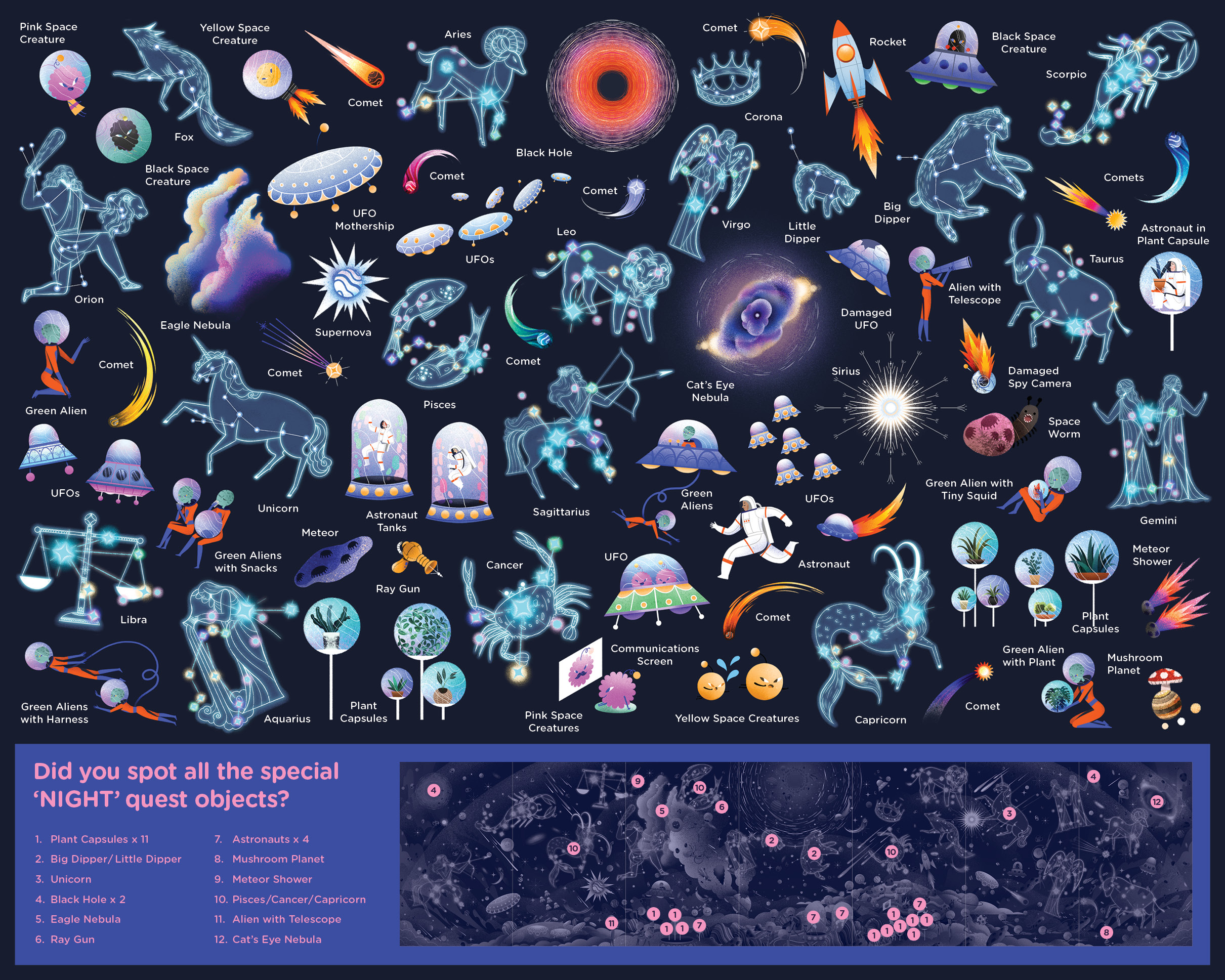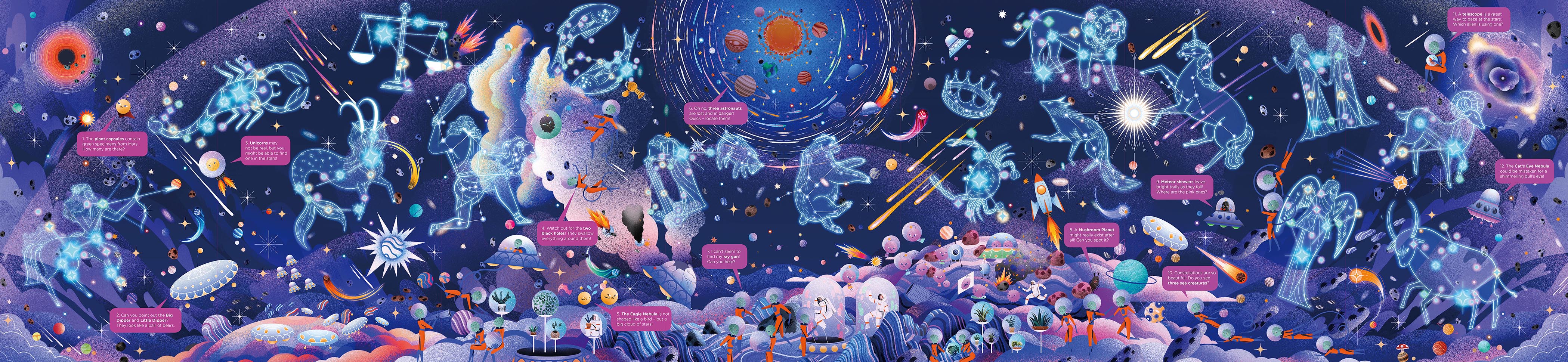 What do 24 hours look like beyond our atmosphere, where the sun and stars can be seen at the same time? In this latest volume of VICTION-VICTION’s best-selling Day & Night series, young readers are invited to explore the exciting possibilities of life in outer space by taking a closer look at what (extra-)terrestrials get up to across two illustrated 1.4-meter long panoramas complete with key constellations. From interplanetary adventures on rockets and spaceships to satellites and space stations that teem with activities, this book offers a fun glimpse into the future through interesting facts, challenging puzzles, and compelling visuals that glow in the dark.